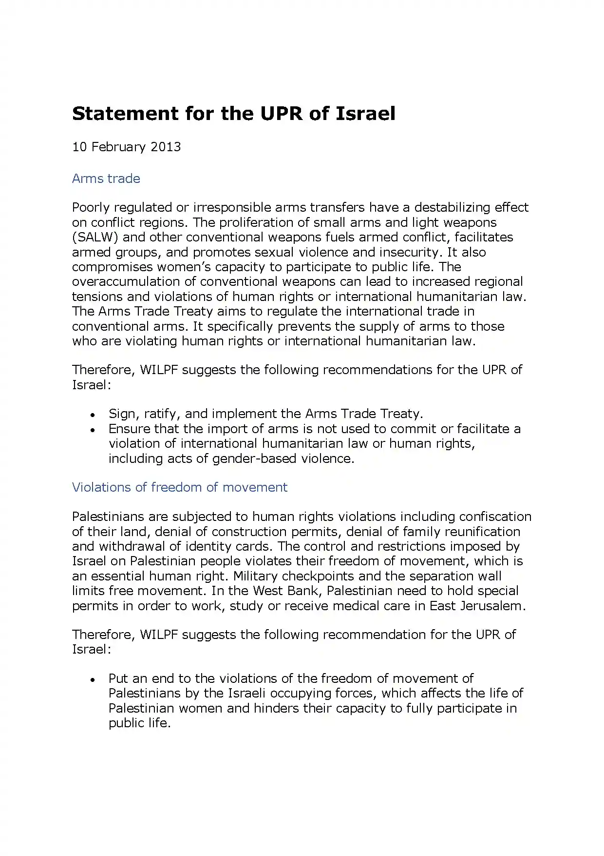 This statement was made to the Universal Periodic Review (UPR) of Israel. WILPF made recommendations regarding Israel arms trade, violations of freedom of movement, political prisoners, nuclear and explosive weapons.