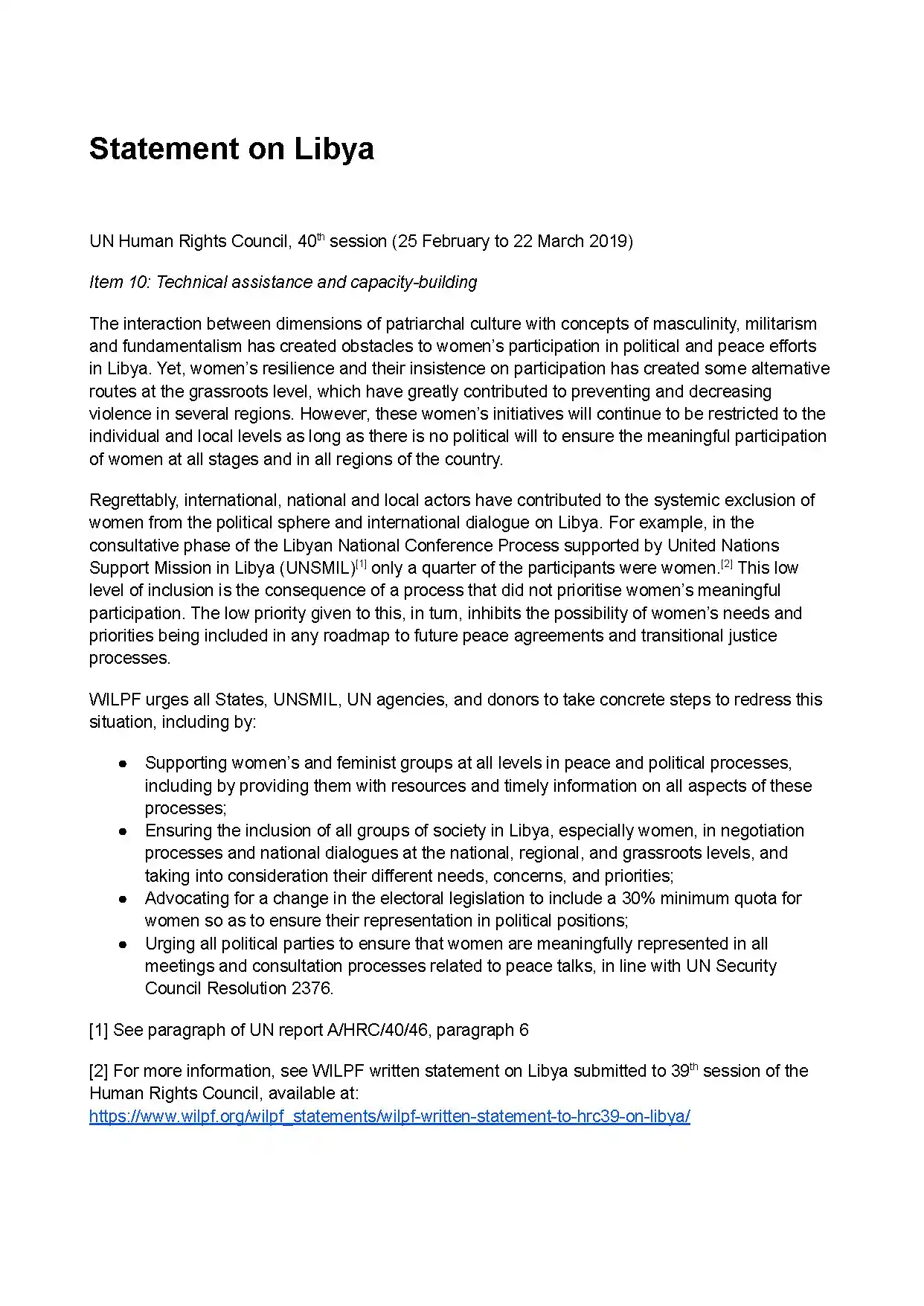 This statement was made to the UN Human Rights Council (HRC) 40th session. In this statement, WILPF urges all States, UNSMIL, UN agencies, and donors to take concrete steps to […]