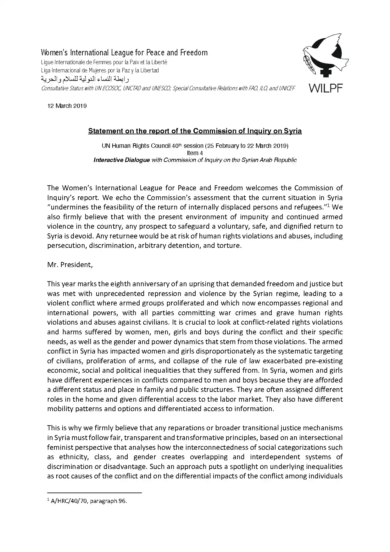 HRC40: Statement on the Report of the Commission of Inquiry on Syria