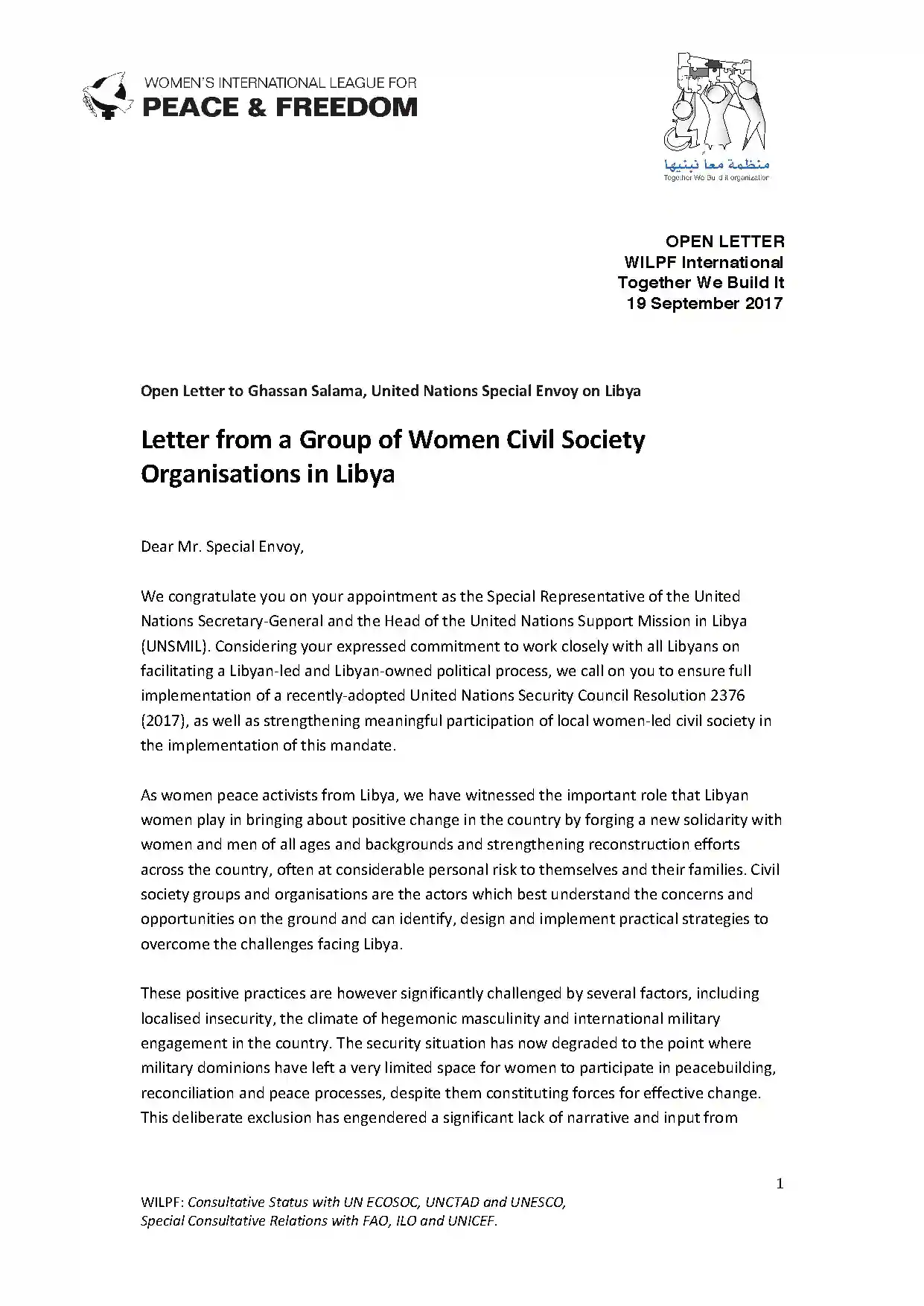 In this open letter, WILPF congratulates Ghassan Salama, United Nations Special Envoy on Libya, on his appointment as the Special Representative of the United Nations Secretary-General and the Head of […]