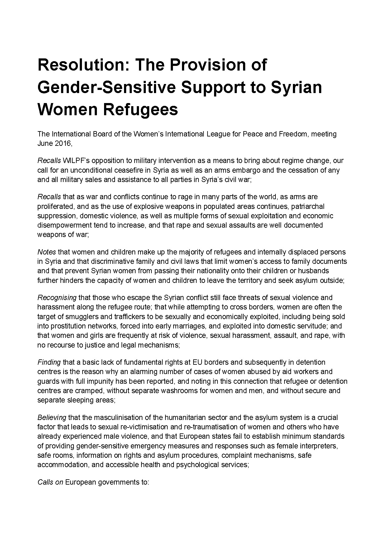 WILPF Resolution on the Provision of Gender-Sensitive Support to Syrian Women Refugees