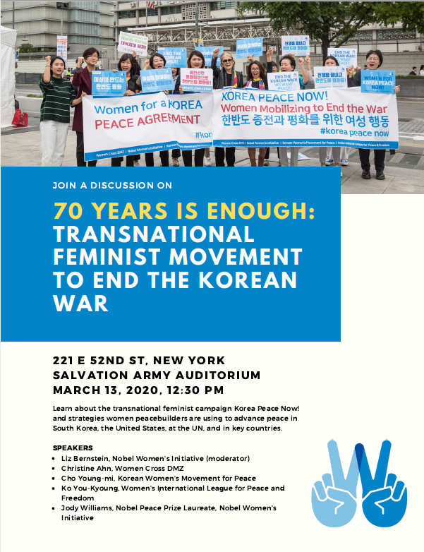 Korea Peace Now! Women Mobilizing to End the War, a global campaign to end the Korean War with a peace agreement, was launched during the CSW63 last year, and has been actively doing the campaign in the US, the UN, Korea and around the world. As the United States’ “forgotten war” turns 70 this year, the transnational feminist campaign Korea Peace Now! is calling for a Korea peace agreement and women’s leadership in the peace process.