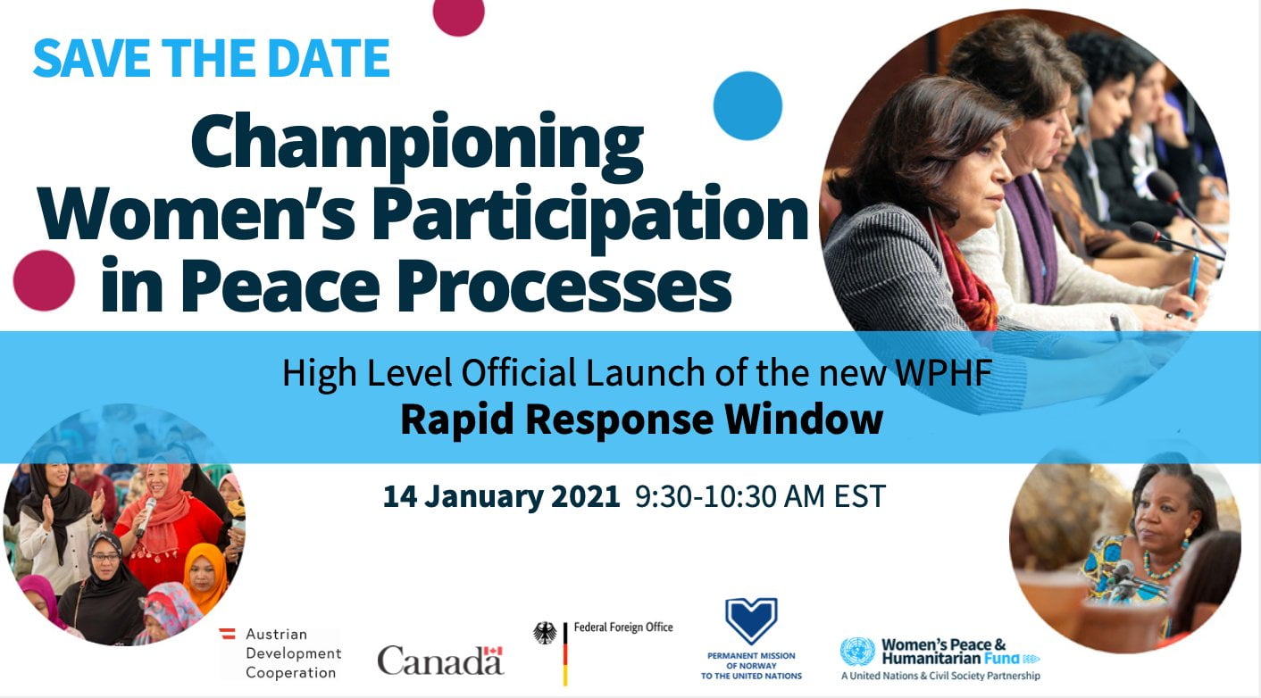 The Women’s Peace & Humanitarian Fund is holding an official high-level launch of the Rapid Response Window on women’s participation in peace processes and the implementation of peace agreements: Championing Women’s Participation in Peace Processes. The event aims at addressing the immediate technical and logistical barriers to women’s participation in peace processes and raise awareness of the opportunities available to civil society for urgent, strategic support to increase women’s participation in formal peace processes and peace agreement implementation.