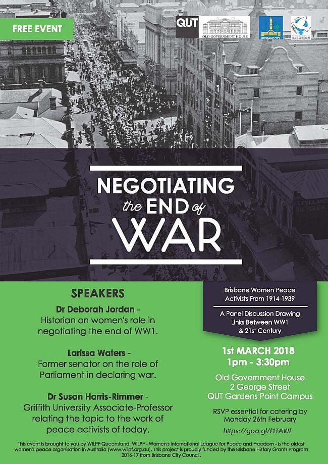 • Queensland historian Dr Deborah Jordan will speak about the findings of her research, including women’s roles in negotiating the end of WW1.