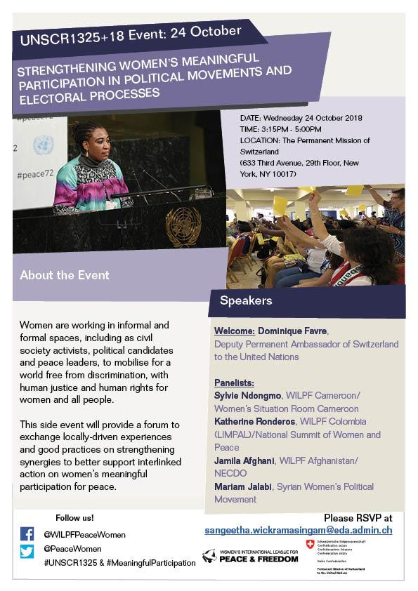 This panel discussion will provide a forum to exchange locally-driven experiences and good practices on strengthening synergies to better support interlinked action on women’s meaningful participation for peace in informal and formal spaces around elections processes, as well as identify multi-level challenges and barriers that continue to prevent women’s participation across different sectors. Bringing together women peace leaders from Afghanistan, Colombia, Cameroon and Syria, participants will share recommendations for what the UN Security Council, UN Agencies and Member States can do to realise their WPS obligations and mobilise key stakeholders to strengthen coordinated action on women’s meaningful participation to address structural obstacles and root causes of conflict and violence.