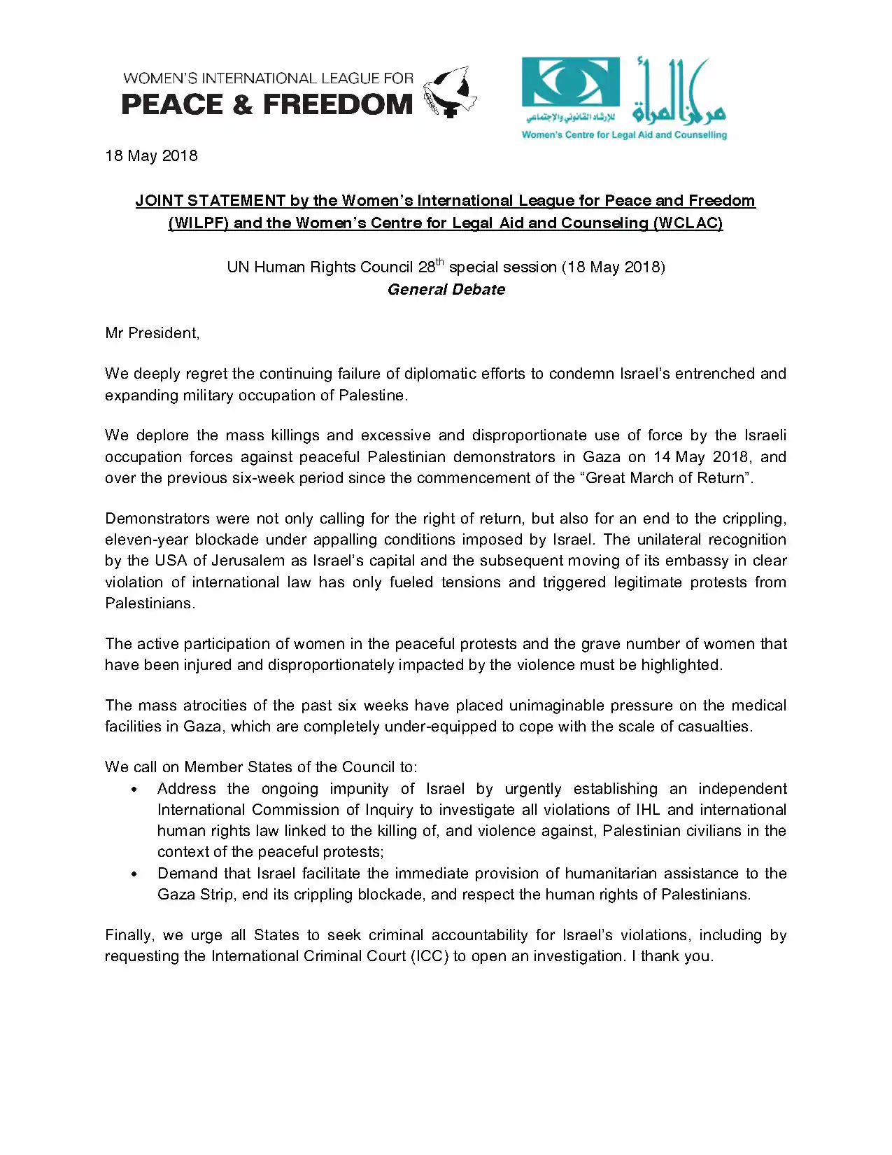 On 18 May 2018, WILPF addressed the UN Human Rights Council (HRC) 28th Special session on the ongoing crisis situation in Palestine. WILPF’s joint statement with the Women’s Centre for […]