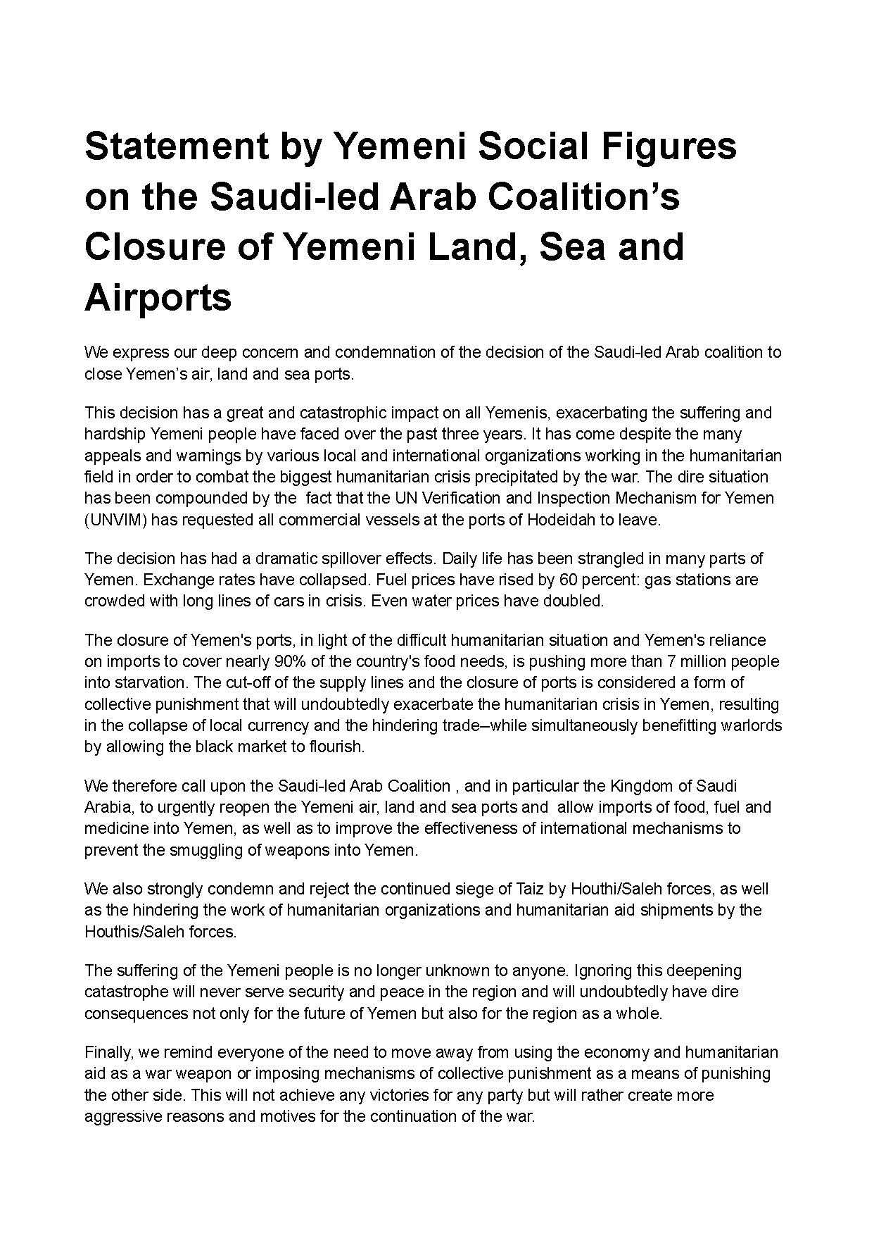 Statement by Yemeni Social Figures on the Saudi-led Arab Coalition’s Closure of Yemeni Land, Sea and Airports