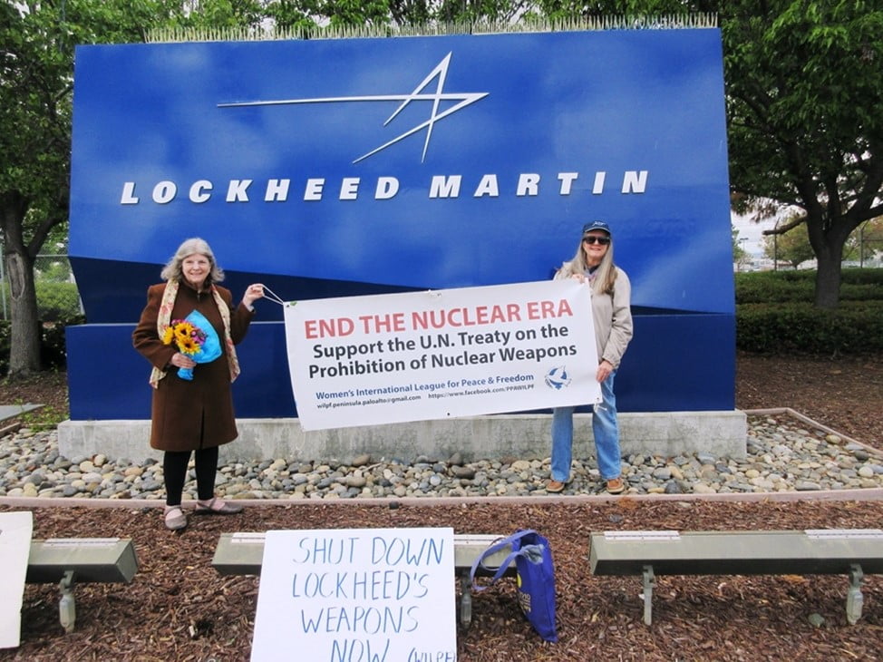 WILPF US member Cherrill Spencer (right) demonstrating against Lockheed Martin outside their facility in Sunnyvale California, USA. Photo: Cherrill Spencer