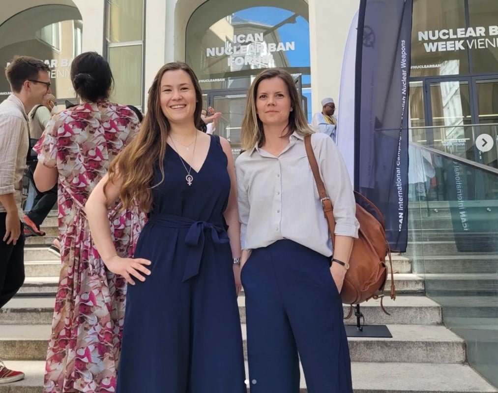 Lina Hjärtström and Malin Nilsson of WILPF Sweden outside the ICAN conference in Vienna, 2022. Photo: IKFF